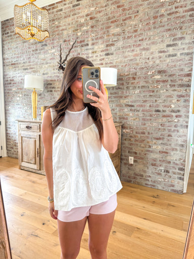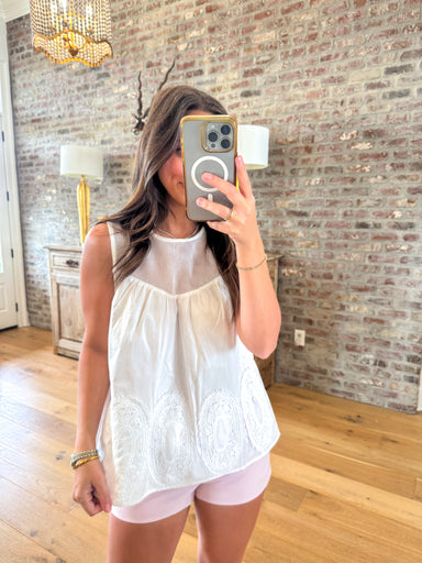 Magnolia Lace Tank That sheer mesh yoke is the kind of detail that makes someone lean in and say "oh wait, that's cute." This sleeveless white top ...
