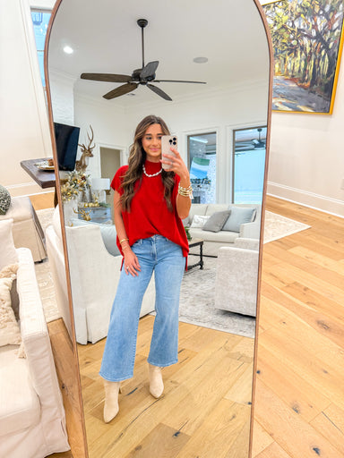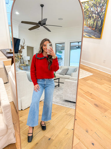 Christmas Plaid Woven Ruffled Collar Sweater – Red Get into the holiday spirit with this festive red sweater, designed to bring classic Christmas c...