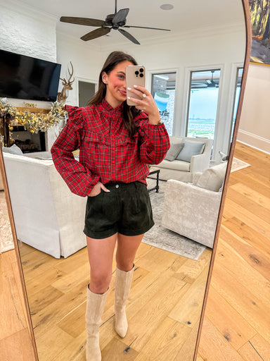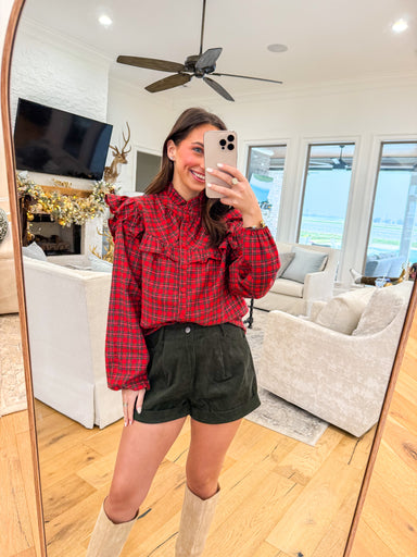 Add a touch of holiday charm to your wardrobe with the Festive Flounce Plaid Blouse. Crafted from 100% soft cotton, this red multi-plaid blouse fea...