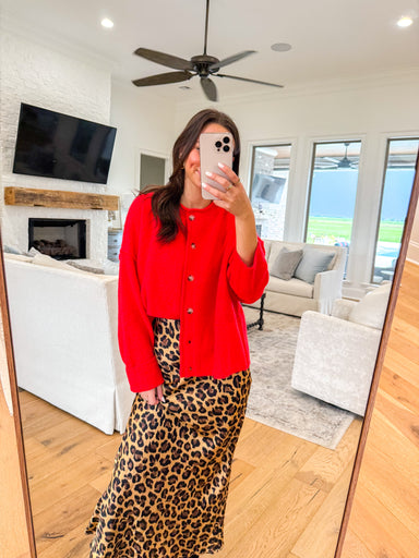 Add a pop of rich, festive color to your wardrobe with our Ruby Red Sweater Cardigan — a chic, feminine layer perfect for the holiday season and be...