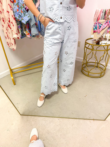 Baby Blue Eyelet Pants The perfect "I've got my life together" pants for coffee runs that turn into impromptu lunch dates. These baby blue beauties...