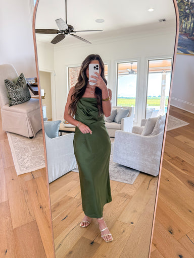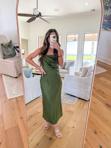 Sophisticated, sleek, and endlessly flattering, The Selene Maxi Dress is designed to make a statement. Crafted in a rich olive green hue with comfo...