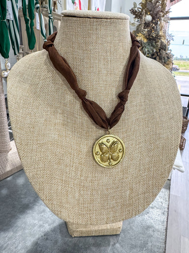 $45.00| /Tan & Blue Cheeta Scarf Necklace Gold Pendant