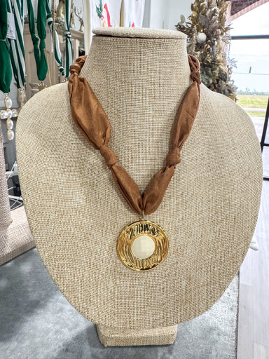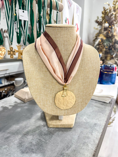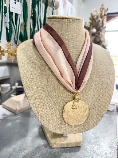 Pink & Brown Large Scarf Necklace Gold Circle Pendant