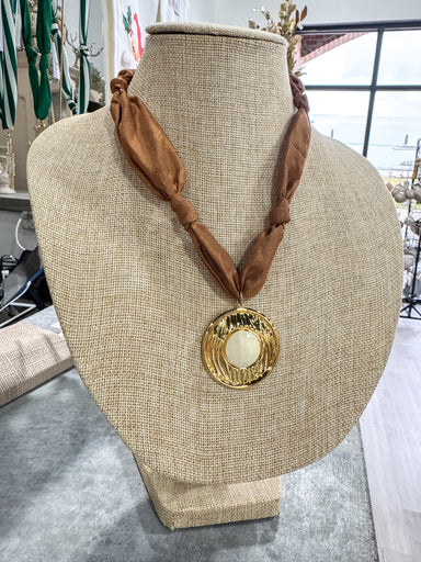 $38.00| /Pink & Brown Large Scarf Necklace Gold Circle Pendant