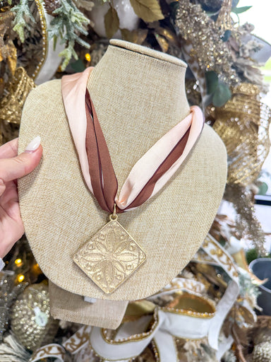 $45.00| /Pink & Brown Large Scarf Necklace Gold Flower Pendant