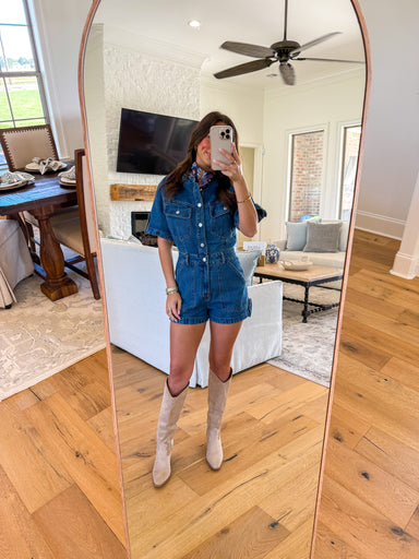 Classic, structured, and effortlessly chic, the Georgia Dark Wash Denim Romper is a wardrobe essential for casual, warm-weather days. Crafted in a ...