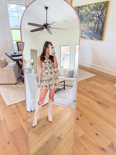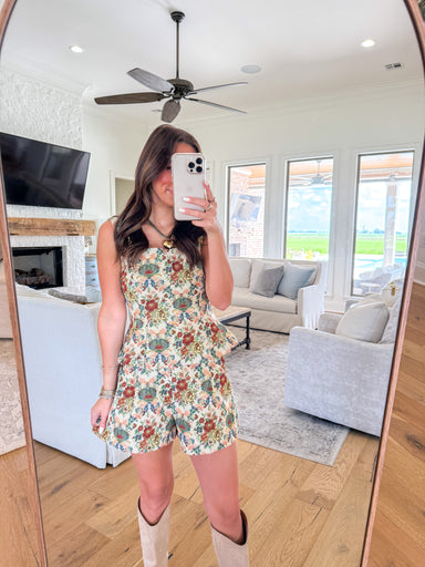 Simple Days Ecru Romper Material: 100% Polyester Romper Round neckline Ruffle sleeves Elastic waist band Ties at waist Buttons down the front ...