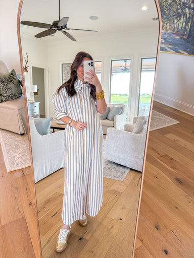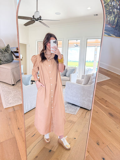 Nina Camel Pinstripe Midi DressClassic with a modern twist — the Nina Camel Pinstripe Midi is crafted in textured cotton poplin for a timeless yet ...