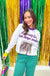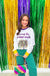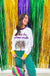 This vibrant top features bold sequin lettering across the chest and a beautifully detailed Mardi Gras–themed tree design in purple, green, and gold sequins. The contrast ribbed neckline, cuffs, and hemline add the perfect pop of color while keeping the fit classic and comfortable.