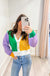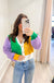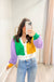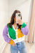 Turn heads in this vibrant sequin-embellished cardigan—a playful mix of bold color and cozy texture. Featuring shimmering yellow and green sequin panels framed by soft lavender sleeves, this statement sweater brings sparkle to everyday style. A deep V-neckline and button-down front give it a flattering, feminine silhouette, while ribbed trim provides a snug, comfortable fit.