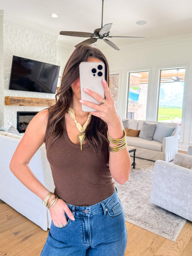 Simple with a flattering twist, The Liv Shirred Knit Top is a must-have staple for effortless styling. This sleeveless brown tank features a classi...