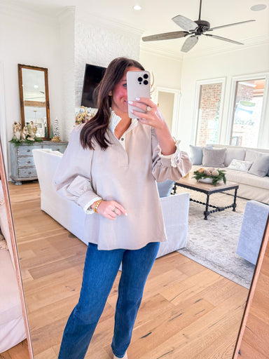 Almond Ruffle Contrast Top Elevate your everyday neutrals with this stunning almond-colored top — the perfect blend of classic and feminine....