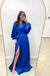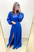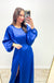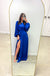 - Pro styling tip: The high slit shows your shoes, so choose metallic or nude heels that complement rather than compete with the bold royal blue - a lower block heel offers comfort for extended wear without sacrificing elegance.