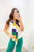 The sleeveless mock neck design offers the perfect balance of sophistication and comfort, while the permanently attached striped scarf in vibrant purple, green, and gold eliminates the hassle of coordinating accessories. The hip-length fit flatters your silhouette beautifully, and the soft knit blend drapes just right whether you're layering under a blazer or wearing it solo.