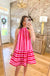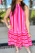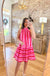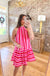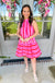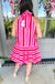 That pink and red stripe combination is giving all the spring energy you didn't know you needed. This little halter dress ties behind the neck, falls into a straight flowy silhouette, and finishes with the sweetest ruffle hem that moves when you move. It's the kind of dress you throw on for Saturday morning errands and still feel completely put together when brunch plans pop up out of nowhere.