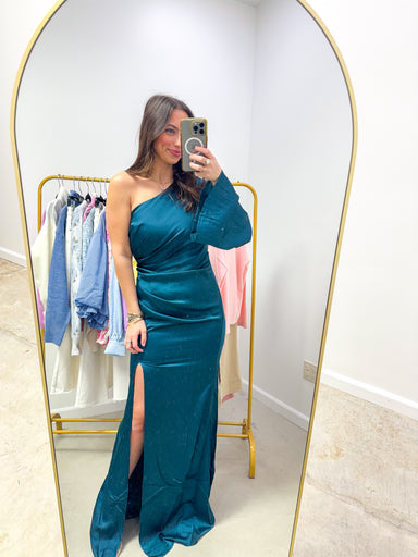Glimmering Muse Emerald Ball Gown Turn every entrance into a moment with this stunning Emerald Satin Slip Maxi Dress—perfect for wedding guests, br...