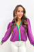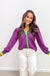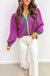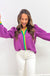 Unlike those boxy jackets that add bulk, this quilted beauty gives you warmth and structure without the weight. The vibrant purple quilted fabric features playful green and yellow ruffle trim that adds personality without trying too hard, while the relaxed fit layers perfectly over everything from fitted tees to flowy blouses.