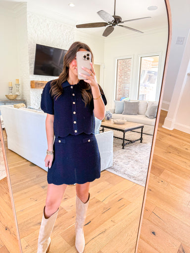 The Carmela Set is a one and done outfit. It features a short sleeve, knit cardigan with novelty buttons and a slim fit, midi skirt. Wear together ...