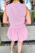 The Lollygag Bubble Shorts are a playful, voluminous style featuring a classic vertical micro-stripe pattern in bright pink and ivory. They are designed with a smocked elastic waistband and a signature bubble hem that creates a soft, rounded silhouette.