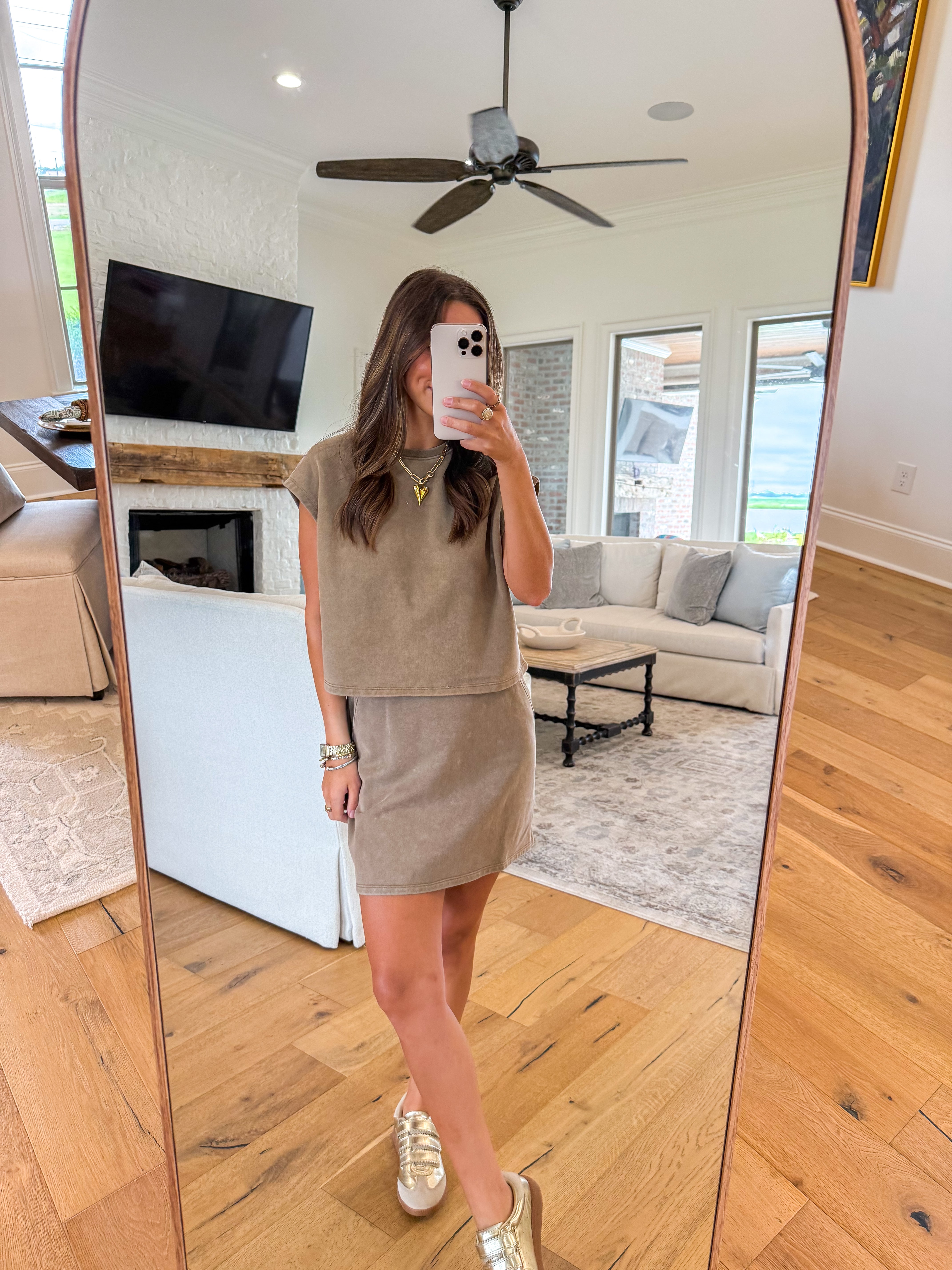 Meet your new go-to for laid-back days: the Always In Style Taupe Set. This ultra-soft matching set includes a cropped top with a boxy fit, round neckline, and casual cap sleeves for a relaxed yet put-together look. The coordinating skirt features an elastic waistband for all-day comfort, built-in shorts for extra coverage, and hidden pockets for convenience. Effortlessly cool and endlessly versatile, this set is perfect for lounging, errands, or dressing up with sneakers or sandals for an easy, chic outfit.