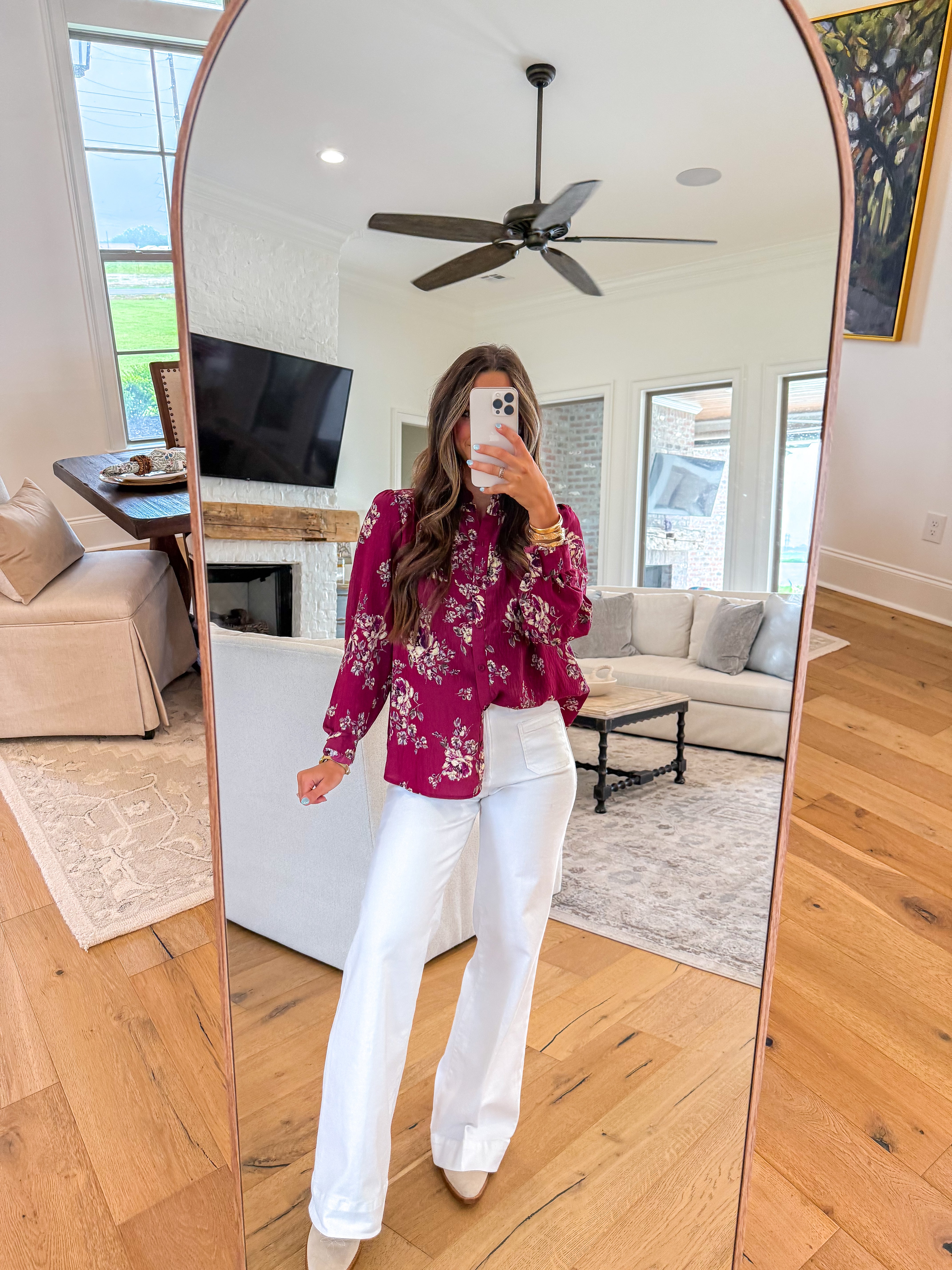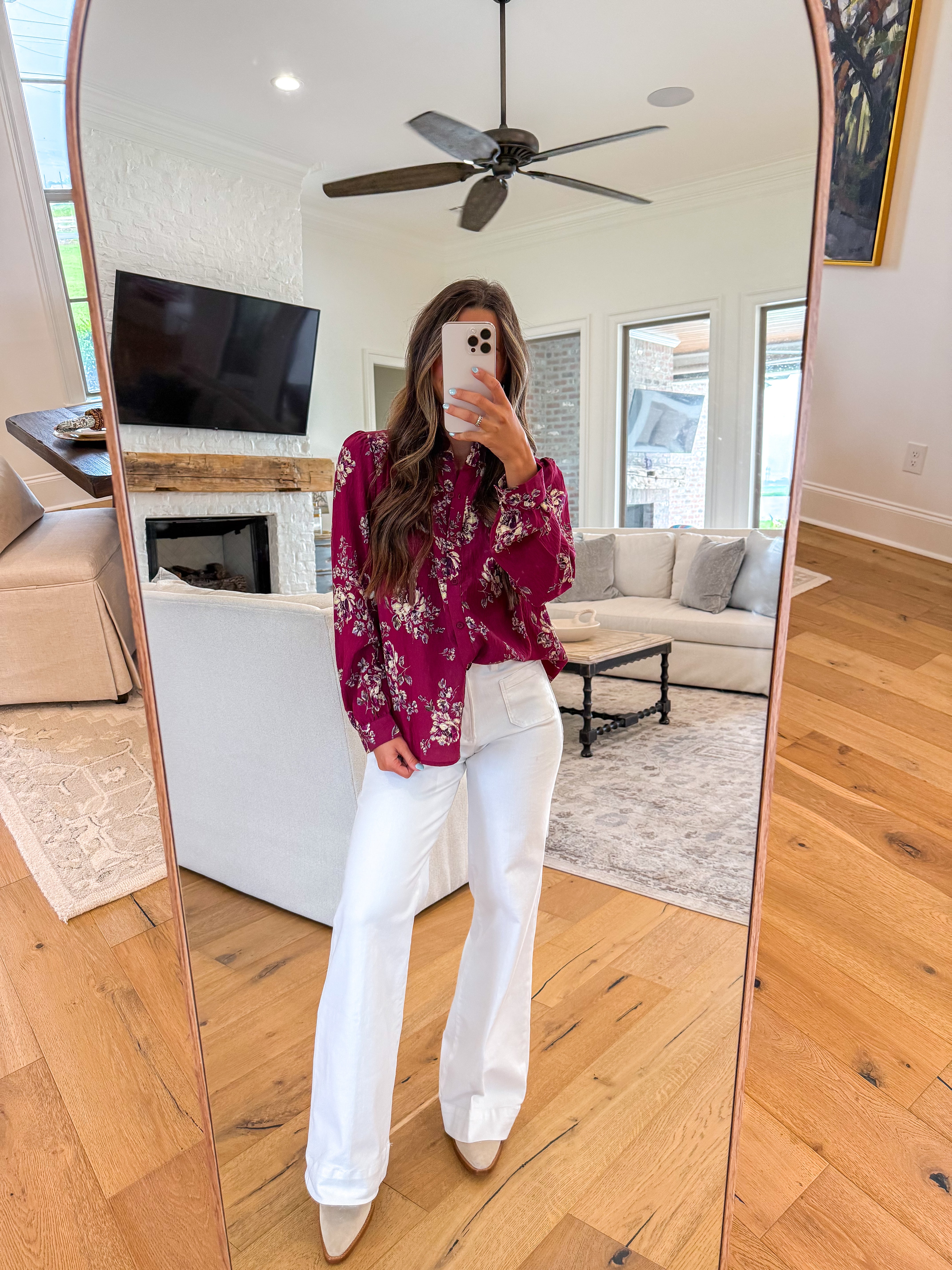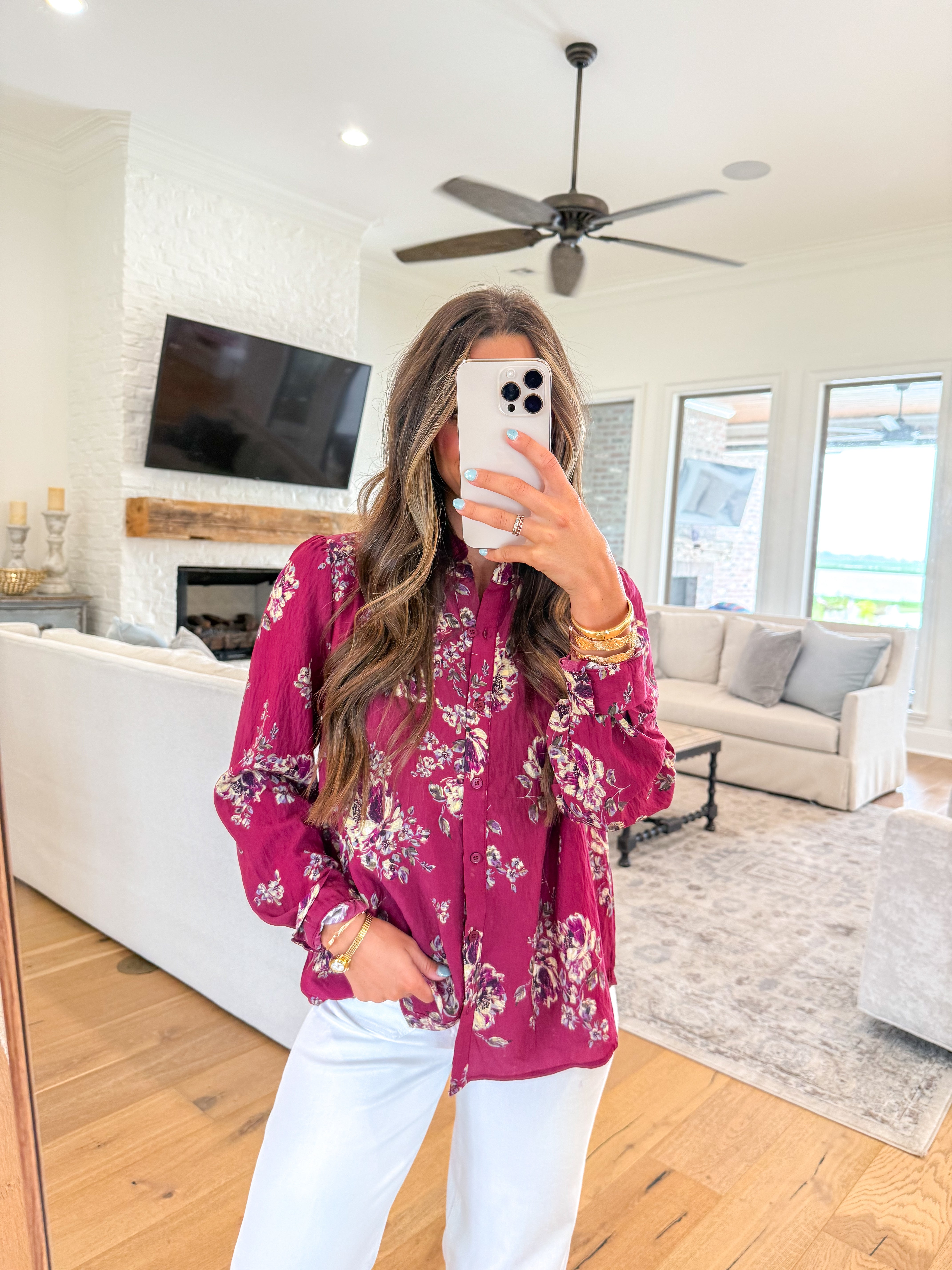 Rich in color and romantic in detail, this Can't Help Myself Burgundy Floral Blouse is a standout piece for any season. Featuring a delicate floral print and a ruffled neckline, it’s designed with long sleeves, buttoned cuffs, and functional buttons down the front for a classic touch. The straight fit offers effortless wear, while the unlined construction keeps it light and breathable. Perfect for dressing up denim or pairing with tailored pieces for a polished, feminine look.