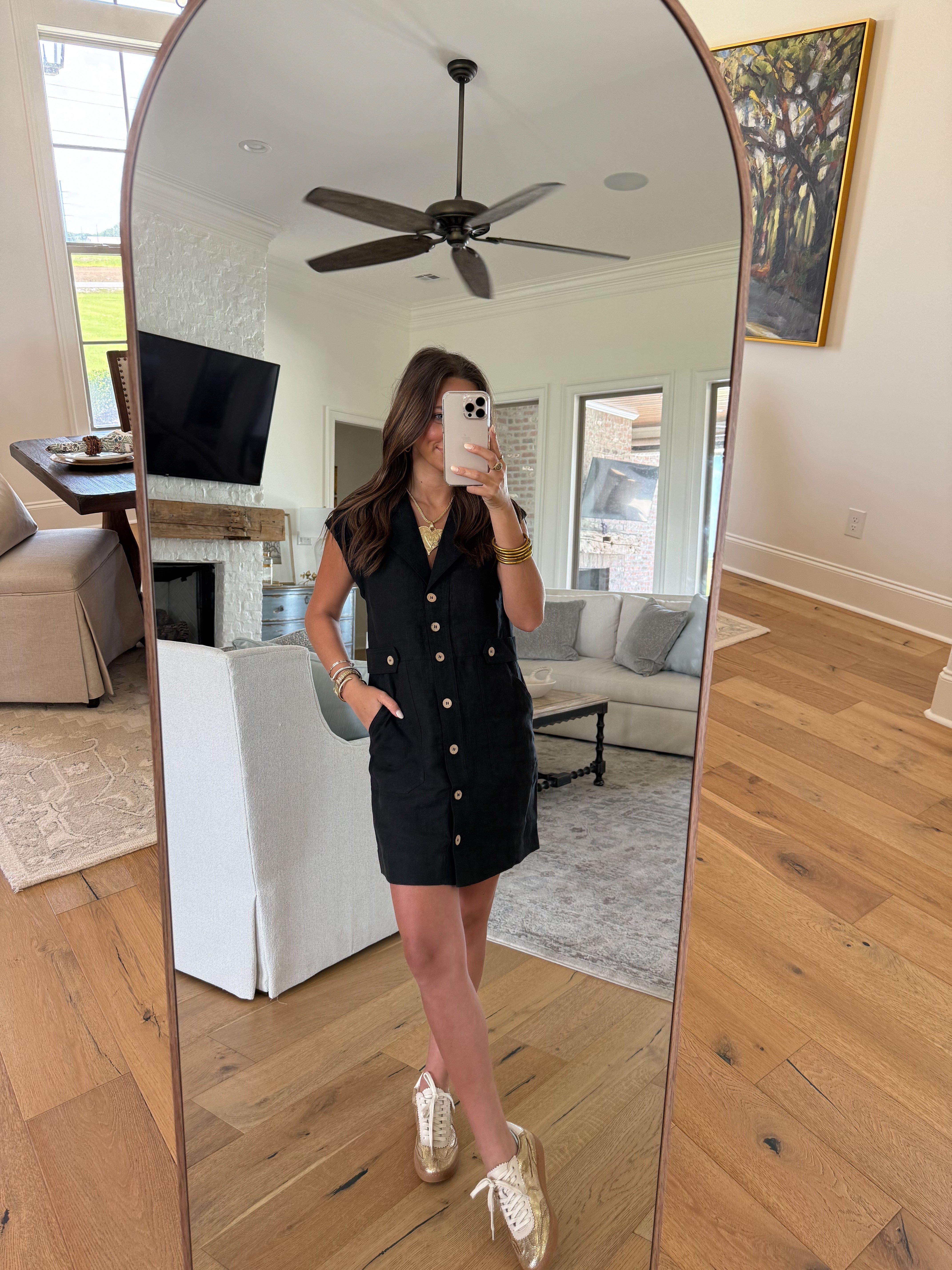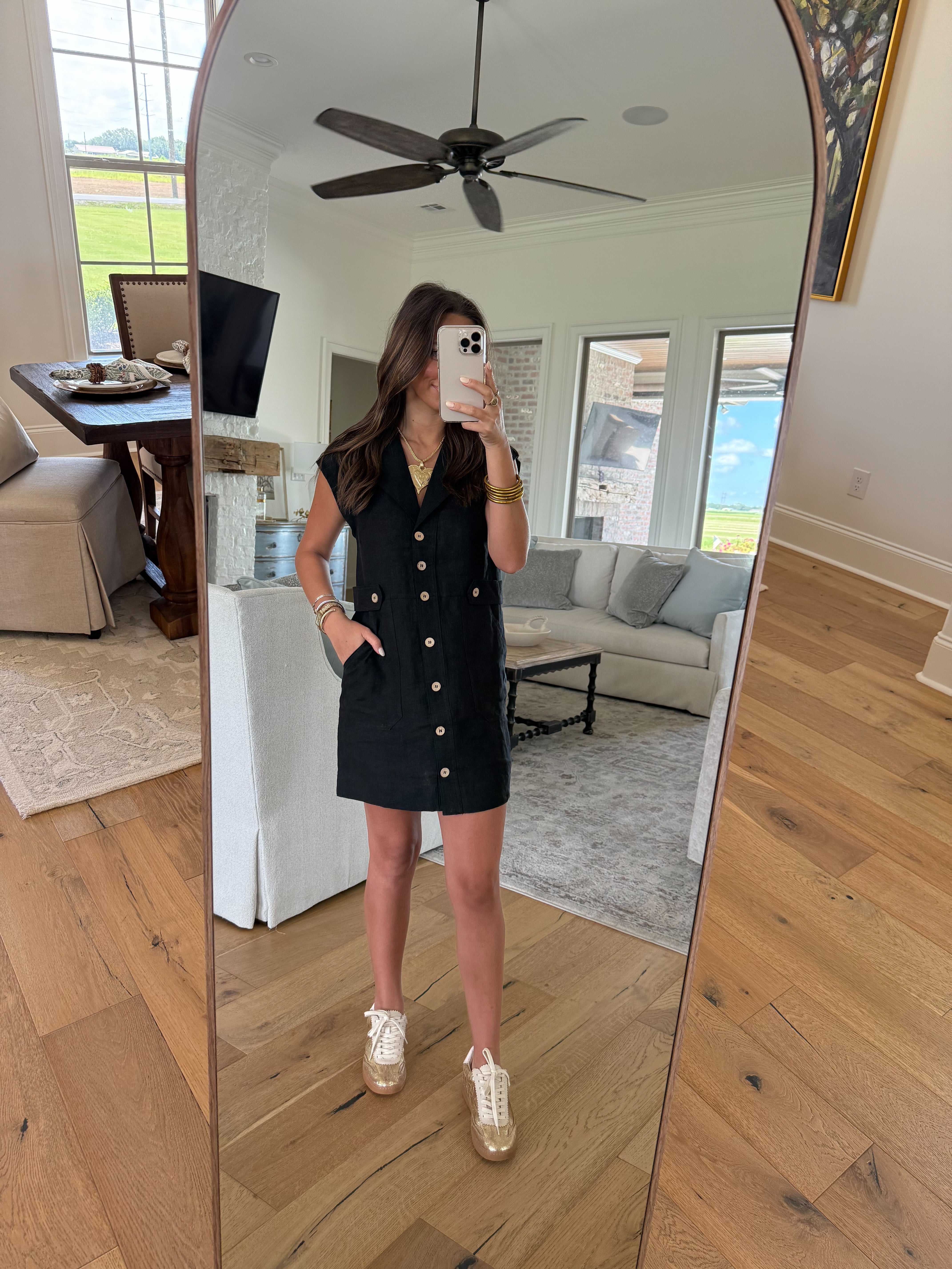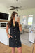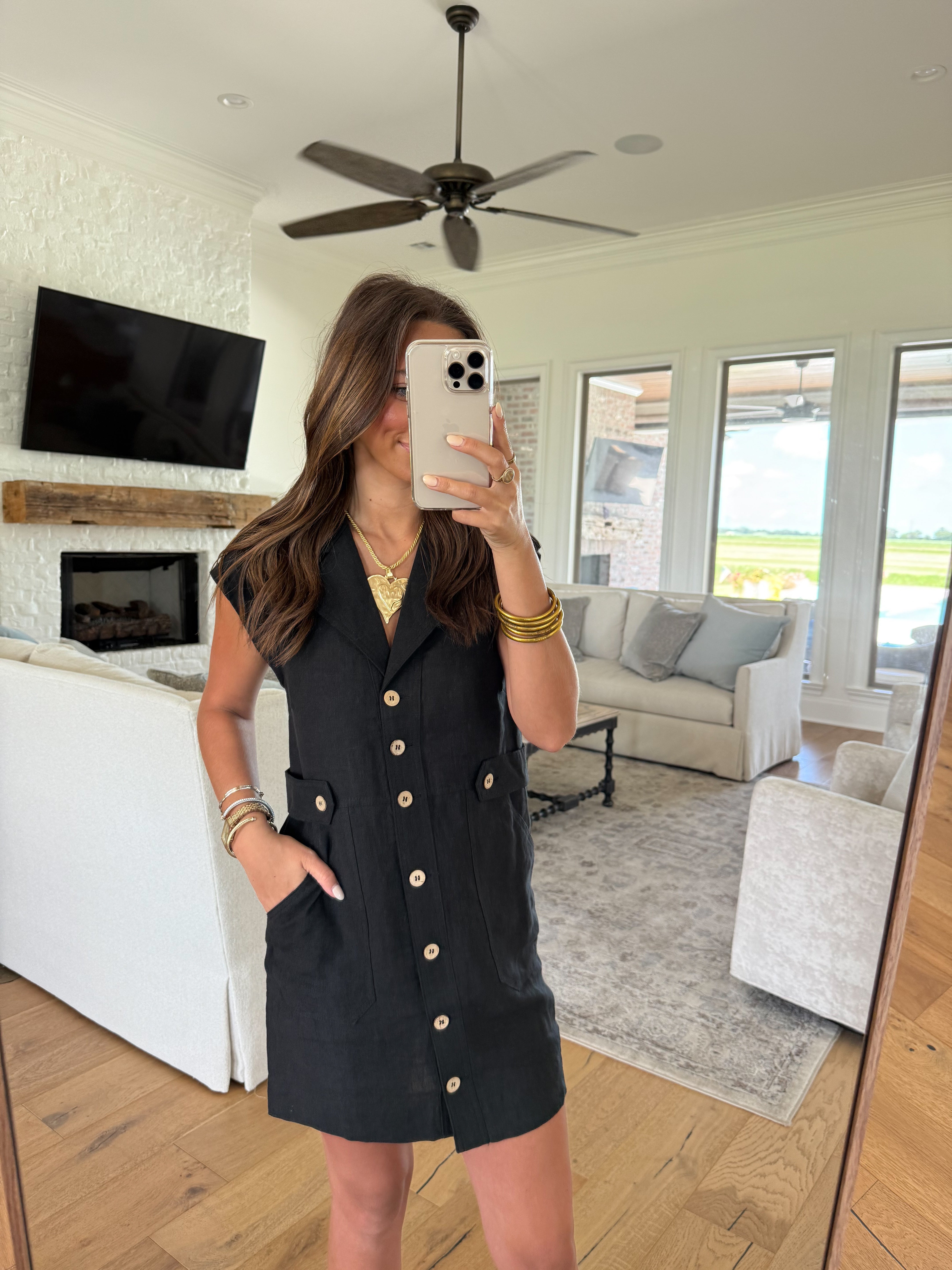 Chic, structured, and effortlessly versatile — our Kaycee Black Mini Dress is a modern wardrobe essential. Designed with a sleek straight fit, this mini features cap sleeves, a classic collar, and working buttons down the front for a timeless look. Button flap details along the sides and functional pockets add a touch of utility-inspired style. Crafted with no stretch for a crisp, tailored feel, this dress transitions seamlessly from day to night — just add your favorite accessories and go.
