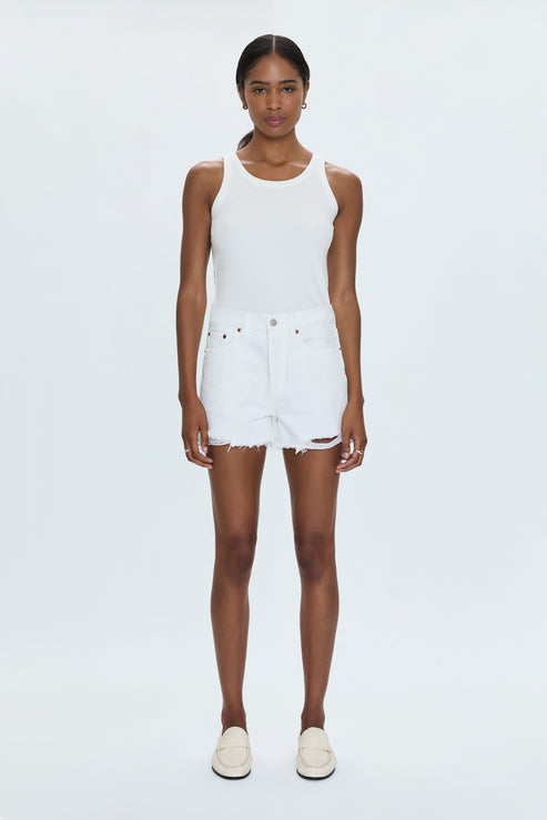High-rise denim short with a relaxed silhouette, in a medium length crafted from rigid non-stretch denim to hold its shape. Offered in rich white colored denim, accented by contrast hardware and medium distressing notes throughout.