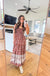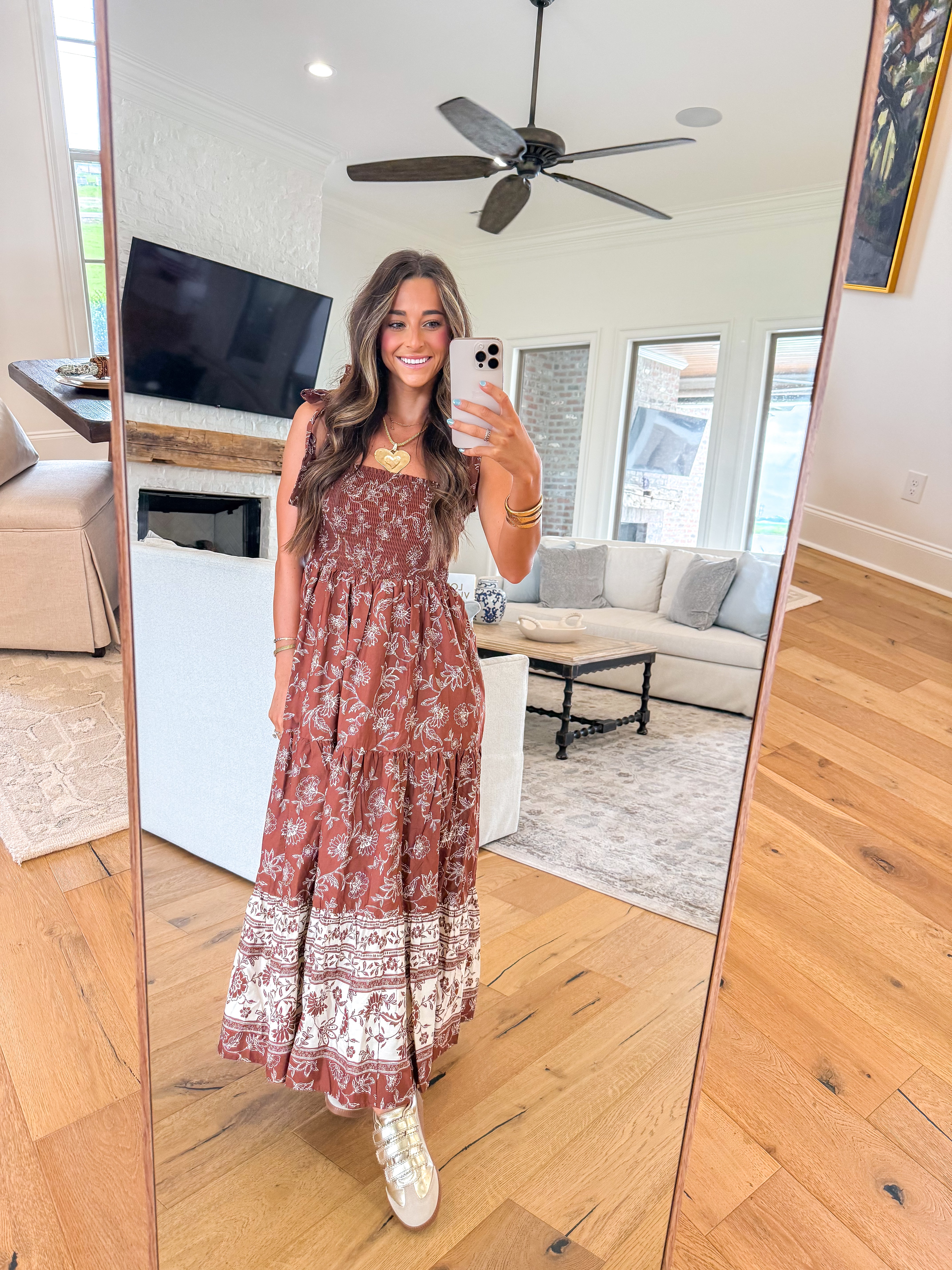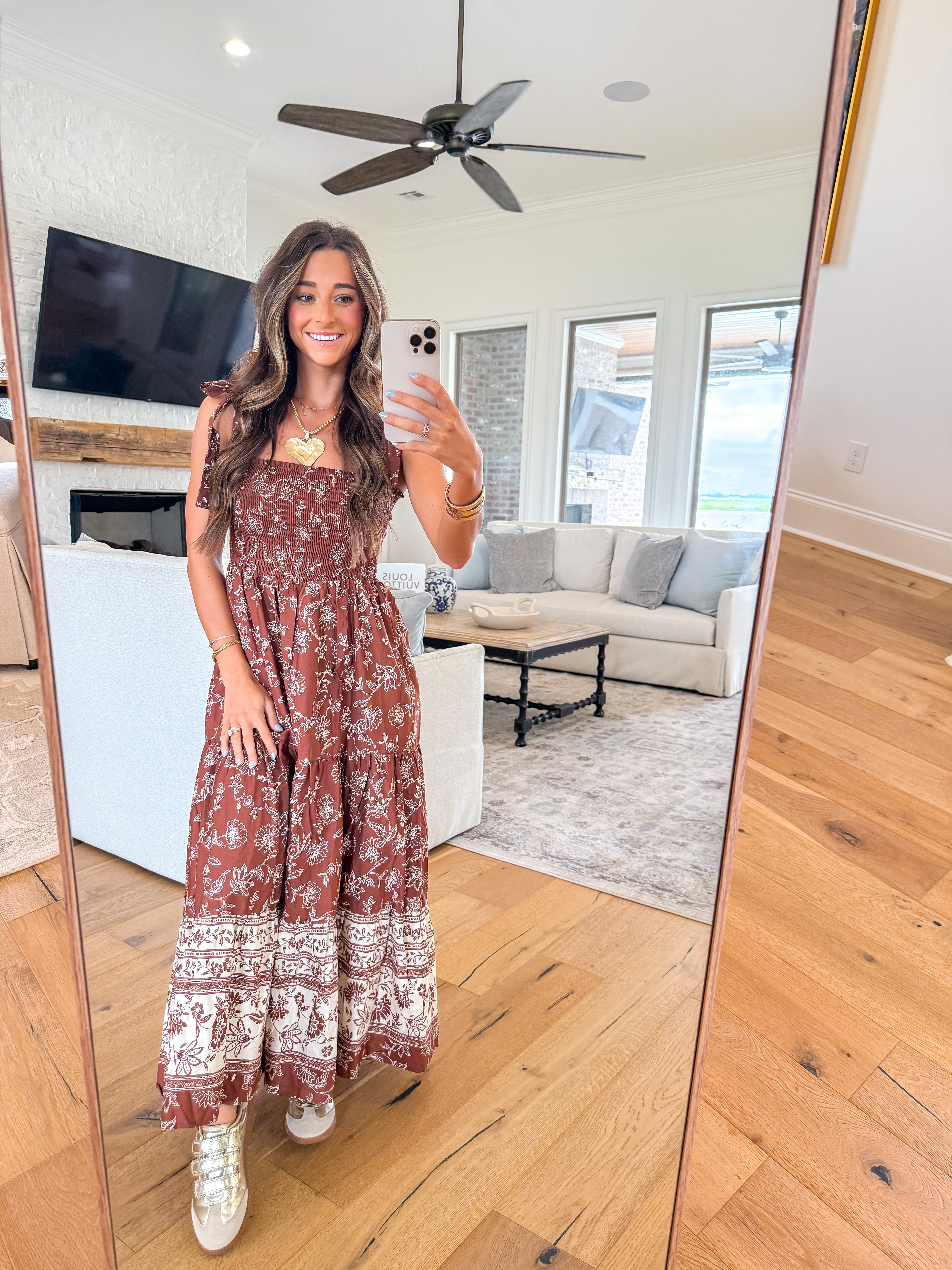 Romantic and effortless, this Taking It All In Brown Floral Maxi Dress is made for everything from weekend strolls to special occasions. Featuring a soft floral print on a warm brown base, it’s designed with adjustable tie straps and a smocked chest for a comfortable, flattering fit. The square neckline adds a touch of vintage charm, while the tiered, flowy skirt creates beautiful movement. Unlined and non-sheer with hidden pockets for convenience, this bump-friendly maxi is as practical as it is pretty. Easy to dress up with heels or keep casual with sandals—this is a true wear-anywhere favorite.