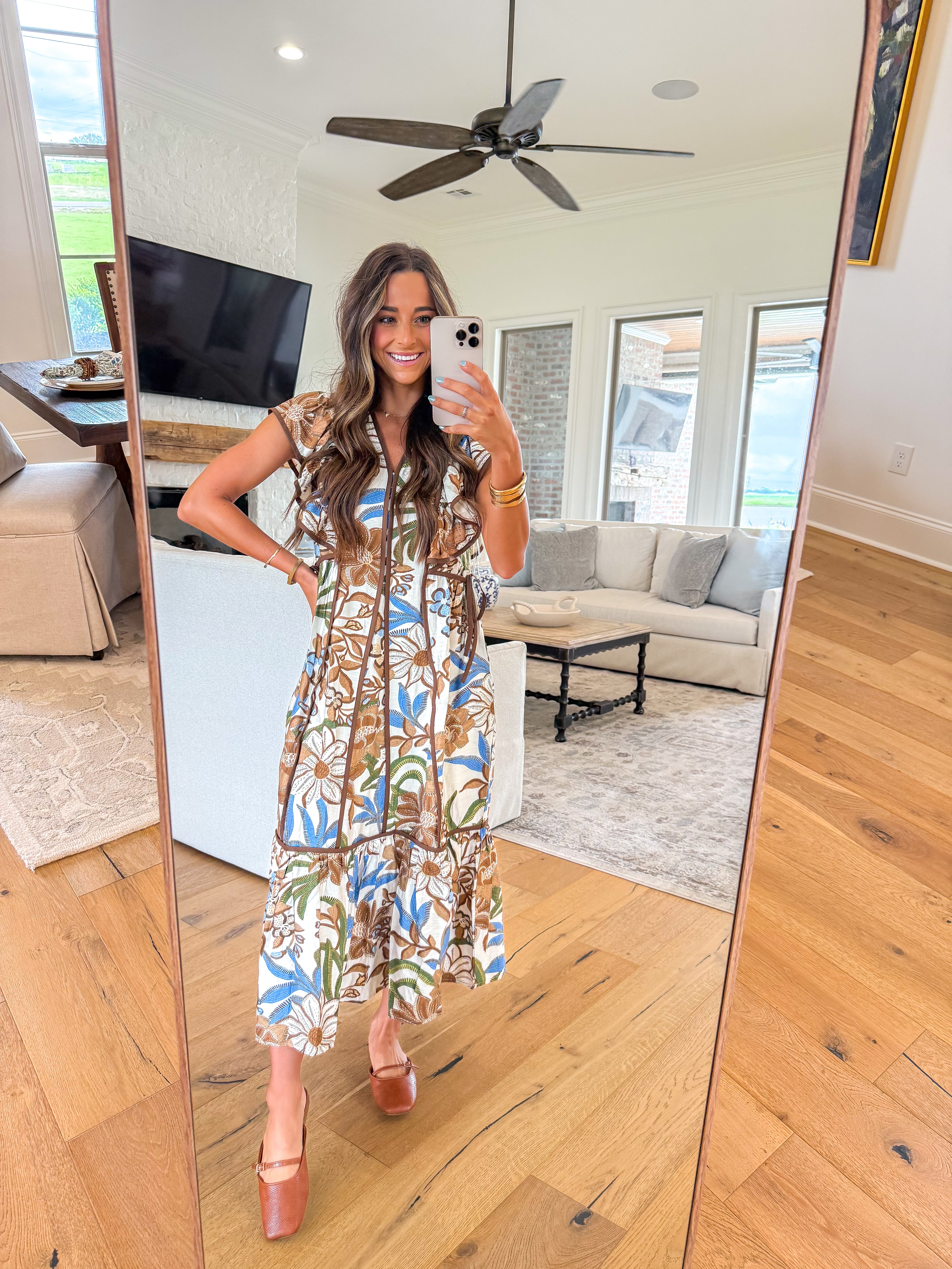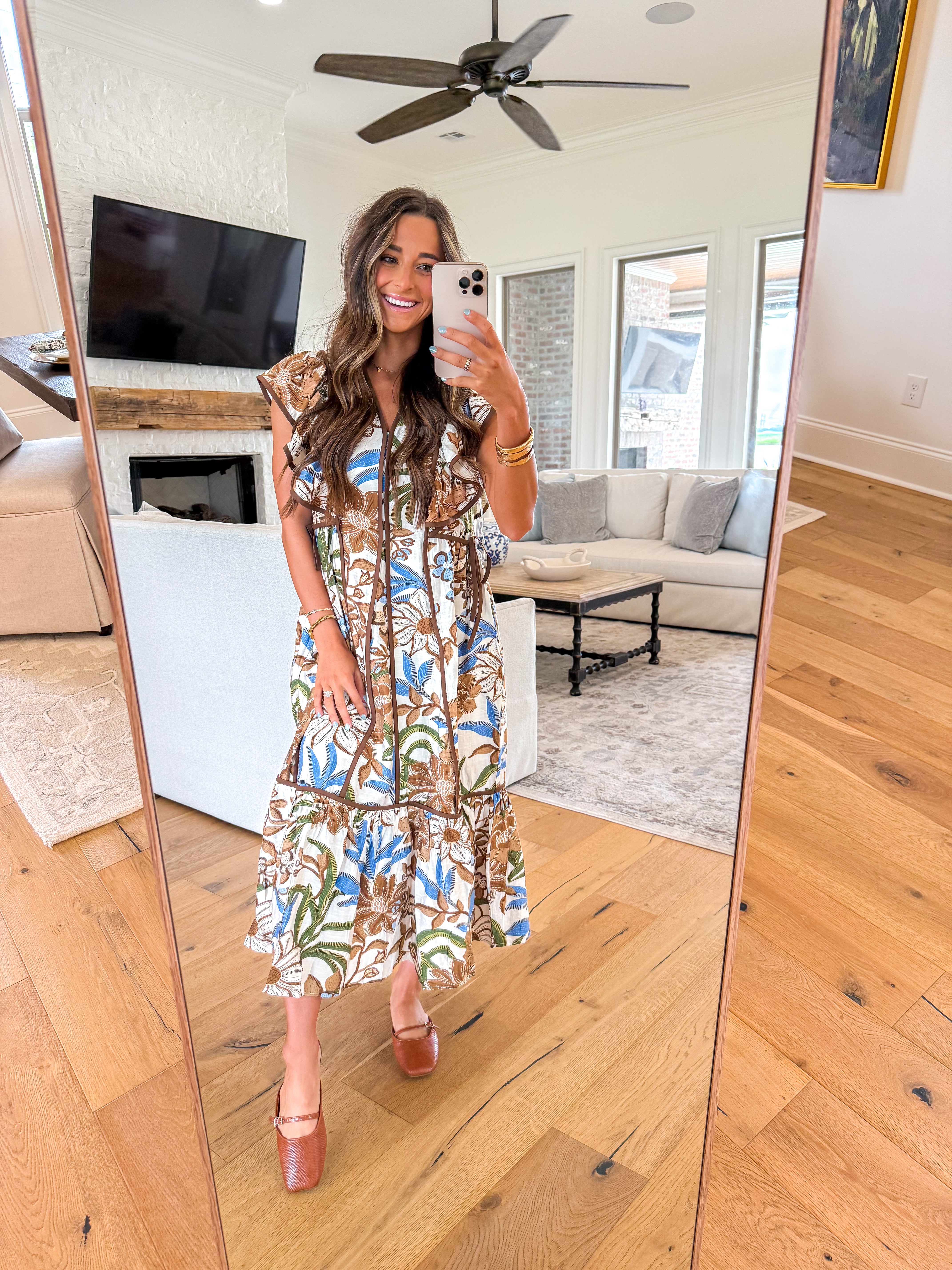 Romantic and effortlessly charming, the Wildflower Whimsy Midi Dress is made for days that call for a little extra magic. Featuring a vintage-inspired brown and blue floral print, this midi-length silhouette is designed with a flattering V neckline, fluttery ruffle sleeves, and a ruffle hem that sways with every step. Self-ties at each side cinch the waist for a custom fit, while contrast trim adds just the right touch of detail. Fully lined for comfort and finished with side pockets for practicality, this dress is your go-to for garden parties, brunch dates, and everything in between.